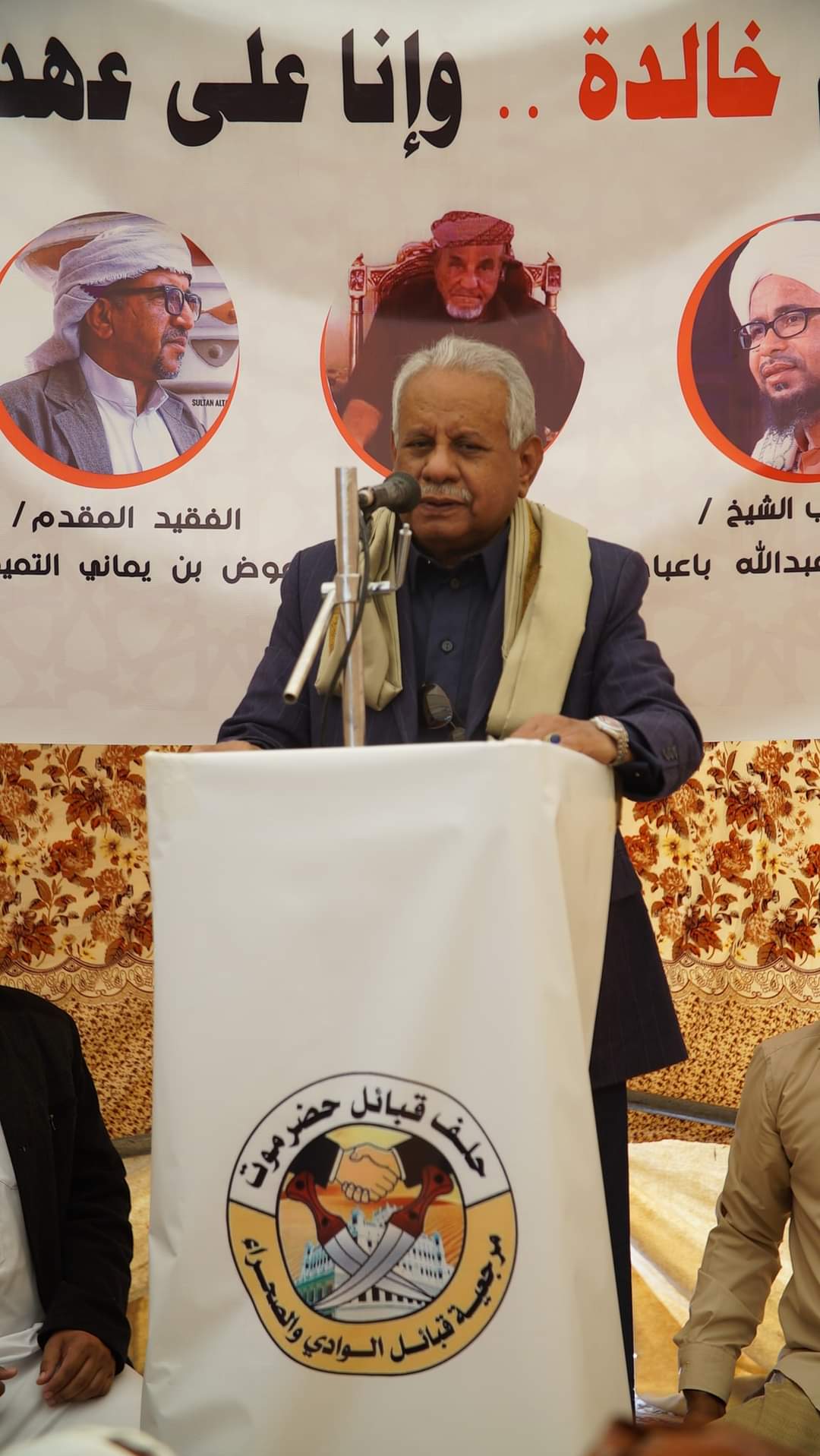 من جانبه ألقى الأمين العام للمرجعية الأستاذ/جمعان سعيد بن سعد ، للحاضرين كلمة أوضح فيها نتائج زيارة وفد المرجعية للعاصمة السعودية الرياض والمشاركة الفاعلة في تسريع تنفيذ اتفاق الرياض وتشكيل الحكومة ، وطالب خلالها رئاسة الجمهورية بسرعة إعلان إقليم حضرموت وأن يكون إقليما مستقلا بكافة الصلاحيات ، حيث لاقت هذه المطالبه قبولا واستحسانا لدى العديد من المراجع القبلية .