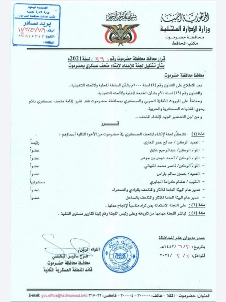 قرارٌ لمحافظ حضرموت بتشكيل لجنة للإعداد لإنشاء متحف عسكري