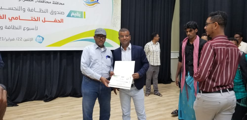نظّم صندوق النظافة والتحسين بساحل حضرموت بقاعة المسرح بمدينة المكلا الحفل الختامي والفني والتكريمي لفعاليات أسبوع النظافة والبيئة لعام 2021م المنعقد تحت ( النظافة ثقافة) وفي الحفل أشار وكيل أول حضرموت الشيخ / عمرو بن حبريش العليي إلى أن هذا الفعاليات تأتي بالتزامن مع الاحتفال باليوم العالمي للبيئة مثمنا جهود صندوق النظافة لإقامة الأنشطة المختلفة بالتنسيق مع الهيئة العامة لحماية البيئة من أجل الحفاظ والاهتمام بالنظافة والبيئة داعيا كافة أفراد المجتمع إلى ضرورة التعاون والتكاتف مع صندوق النظافة ومساندتهم لما من شأنه تطوير وتحسين الخدمات لقطاع النظافة في الأحياء السكنية بالمدينة والإسهام في توفير الصحة والسلامة للمجتمع بالمحافظة.