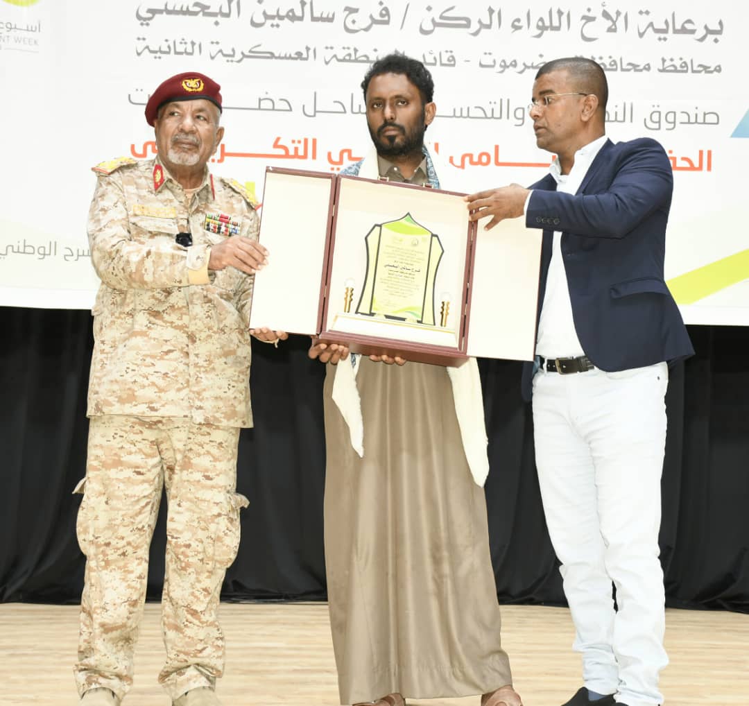 وفي ختام الحفل قام وكيل أول حضرموت الشيخ عمرو بن حبريش العليي وأركان حرب المنطقة العسكرية الثانية عويضان الجوهي والمهندس فهمي بن شبراق المدير العام التنفيذي لصندوق النظافة والتحسين بساحل حضرموت بتكريم السلطة المحلية بالمحافظة وجميع المرافق والمؤسسات الحكومية والجهات المساهمة ووسائل الإعلام وتسليمهم الدروع والشهادات التقديرية عرفانا لدورهم البارز في إنجاح فعاليات أسبوع النظافة والبيئة لعام 2021م