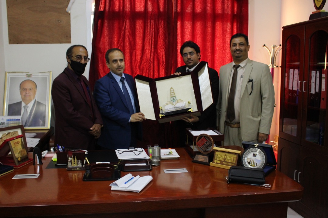 وفي ختام اللقاء قدم الوفد درع مؤسسة حضرموت للتنمية لمعالي أ. د خالد الوصابي.
