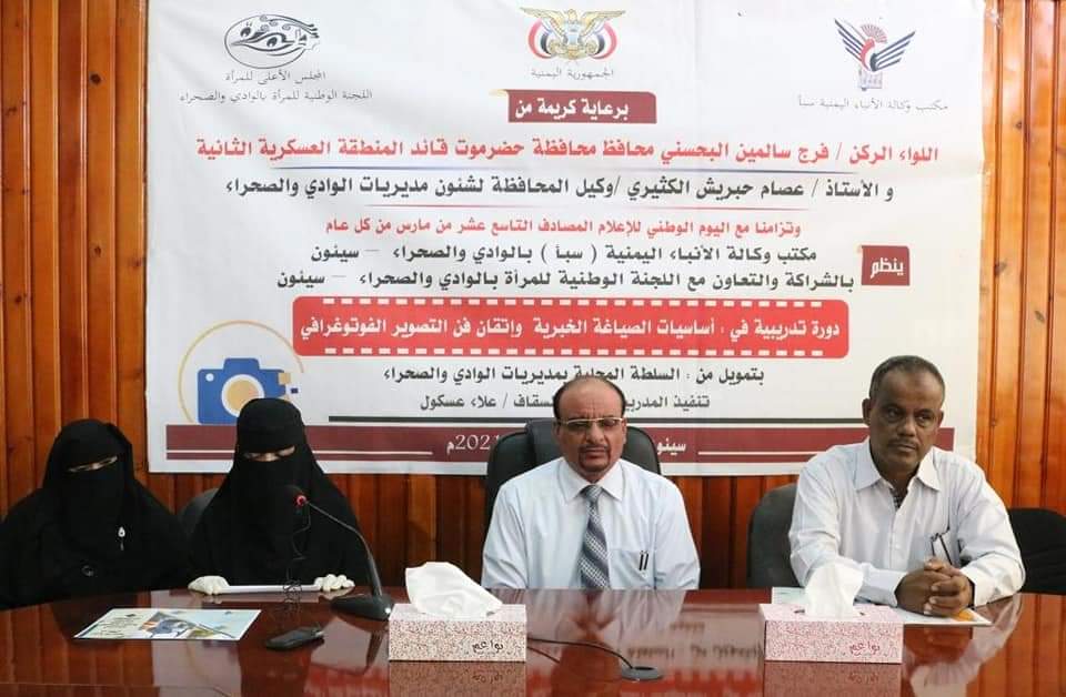 فيما أوضح مدير عام مكتب وكالة الأنباء اليمنية (سبأ) بسيئون عبدالباسط باصويطين، ورئيس اللجنة الوطنية للمرأة بالوادي والصحراء فاطمة النوبي، الى أن هذه الدورة تأتي انطلاقا من أهمية العلاقة التشاركية بين مكتب الوكالة واللجنة الوطنية للمرأة وكذلك الجهات ذات الاختصاص للمشاركة في كافة الأنشطة التنموية ومنها التنمية البشرية باعتبارها الأساس في التنمية الشاملة.
