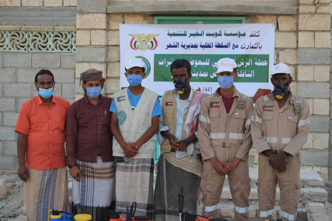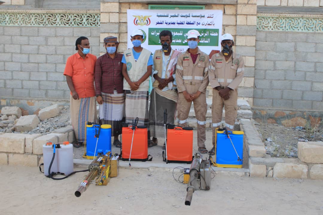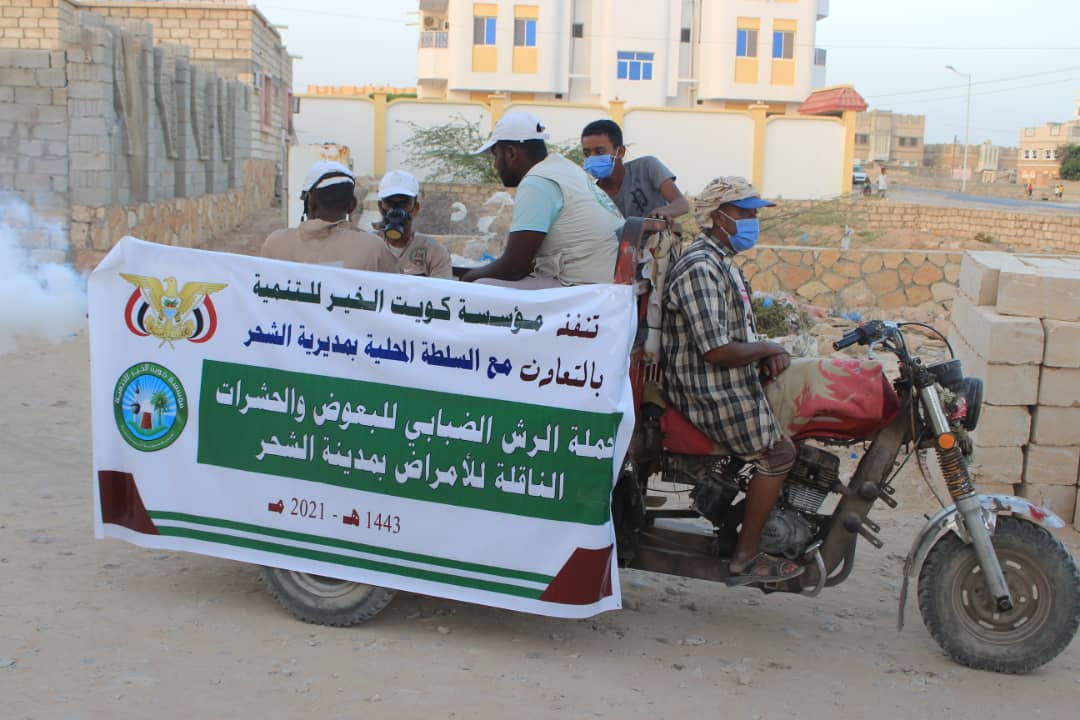دشّن نائب المدير العام لمديرية الشحر الأستاذ مصبح البحسني والمدير التنفيذي لمؤسسة كويت الخير للتنمية الأستاذ محمد صالح شنظور عصر هذا اليوم الأربعاء ٢٠٢١/٣/٢٤م حملة الرش الضبابي لمكافحة البعوض الناقل للحميات في مدينة الشحر بالتعاون مع السلطة المحلية بالمديرية بتمويل و تنفيذ مؤسسة كويت الخير للتنمية.