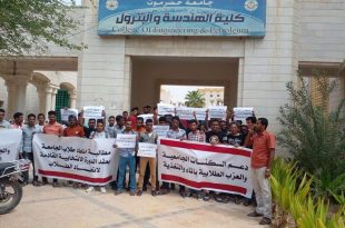 إقرا أكثر »وقفة احتجاجية لطلاب كلية الهندسة والبترول بجامعة حضرموت للمطالبة بتحسين السكنات الجامعية